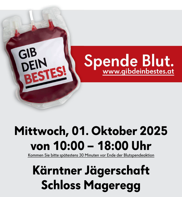 Die Kärntner Jägerschaft lädt gemeinsam mit dem Blutspendedienst des Roten Kreuz Kärnten alle Mitglieder und die gesamte Bevölkerung herzlich zur Blutspende ein.